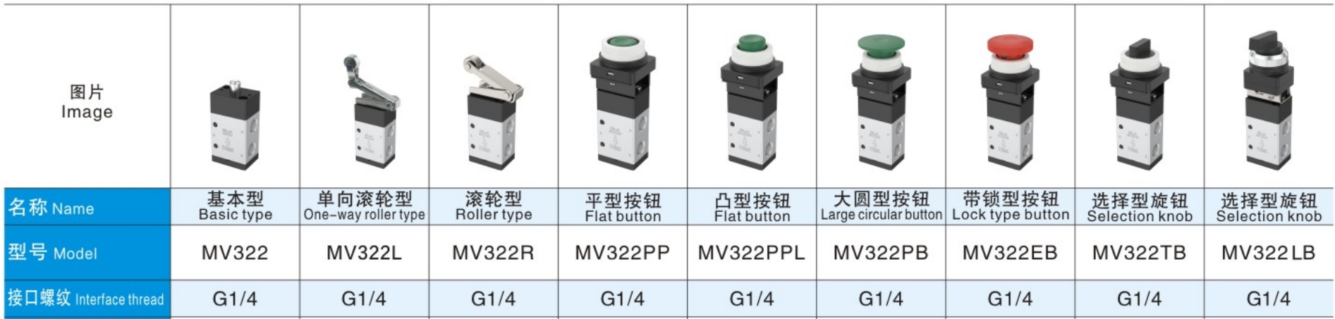 MV522 Механичният клапан е 2 позиция 5 начин; MV322 Механичният клапан е 2 Позиция 3 начин.