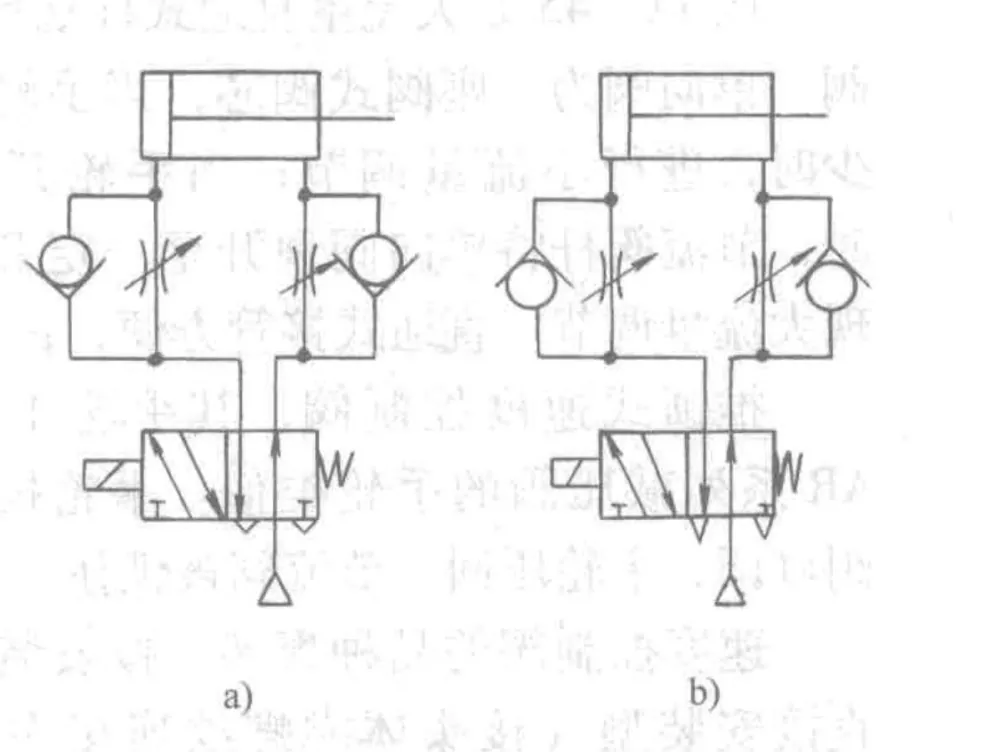 · При (a) (дроселиране на отработените газове), когато насочващият клапан се задейства, възвратният клапан от страната на входа на цилиндъра се отваря, позволявайки на страната без прът да се напълни бързо. Въздухът от страната на пръта може да излиза само през дроселната клапа. Чрез регулиране на отвора на дросела може да се контролира скоростта на цилиндъра. Този метод осигурява стабилно движение на буталото и е най-често използваната схема.