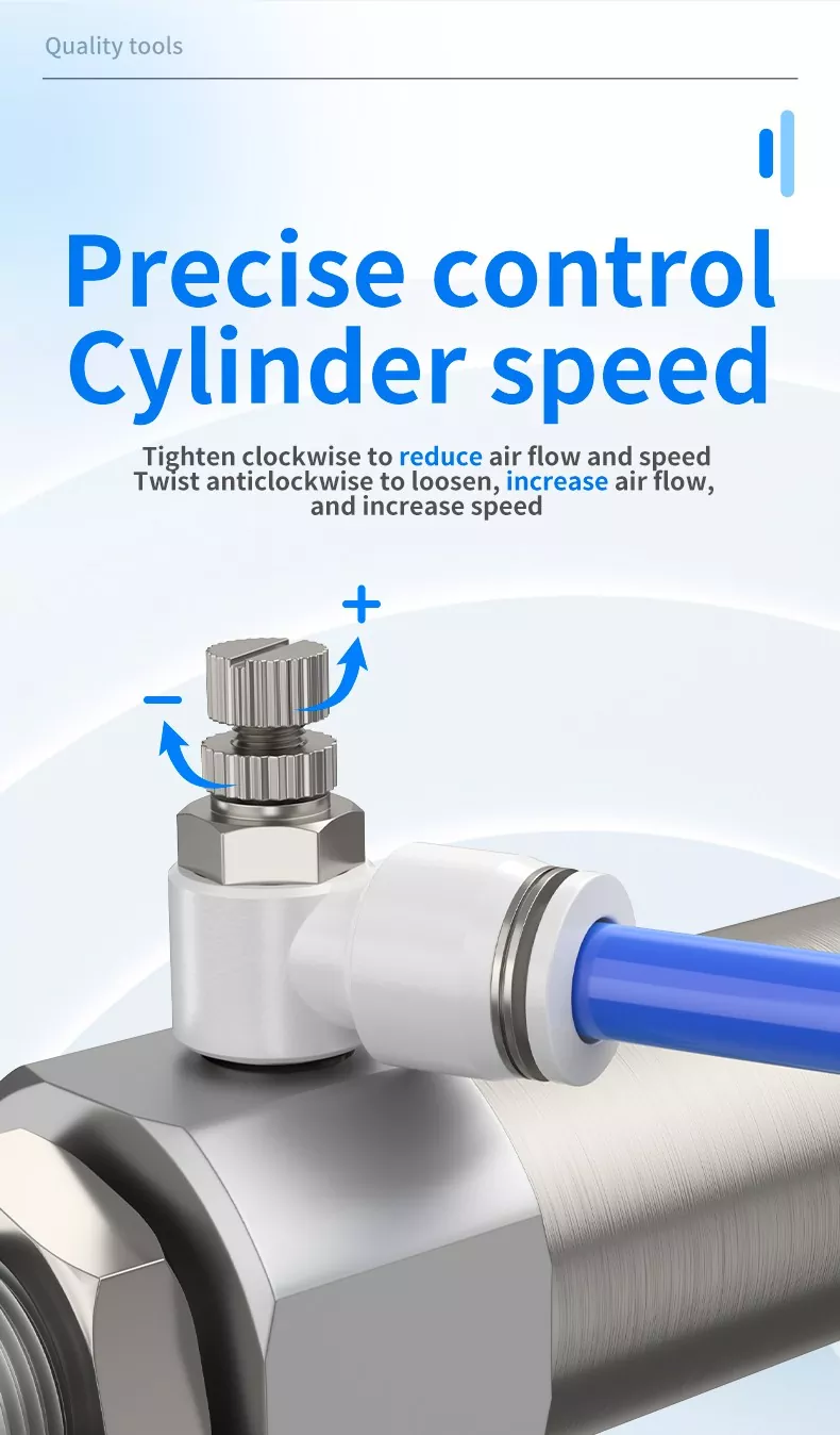 6. Пневматичен регулатор на скоросттаса висококачествени пневматични регулатори на скоростта, предназначени за прецизно регулиране на скоростта на актуатора. С проста, но надеждна структура, всеки клапан интегрира дроселов механизъм и еднопосочен възвратен клапан, позволявайки контролиран въздушен поток в една посока, като същевременно позволява свободен обратен поток.