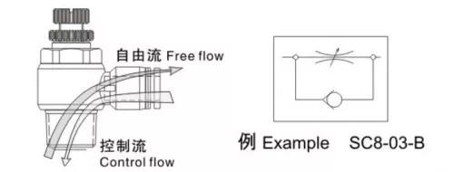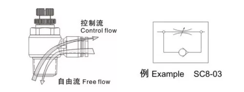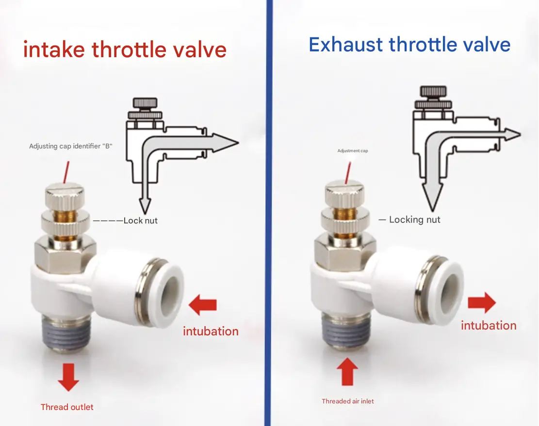 От функционалните символи можем да видим, че както изпускателният, така и входящият контролен клапан са еднопосочни дроселни клапани, контролиращи потока само в една посока, като същевременно позволяват на обратния въздушен поток да преминава свободно. За двойнодействащи цилиндри се предпочитат изпускателните дроселни клапи за подобряване на стабилността на движение на цилиндъра. За еднодействащи цилиндри, които обикновено използват пружина за удължаване или прибиране, когато няма подаване на въздух, газът трябва да преодолее силата на пружината по време на работа, така че входящите дроселни клапи са подходящи за контрол на скоростта.