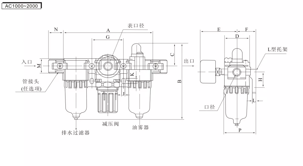 AF (въздушен филтър) + AR (вентил за регулиране на налягането) + AL (лубрикатор с маслена мъгла) = AC троен модул