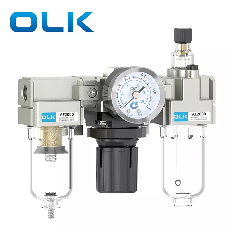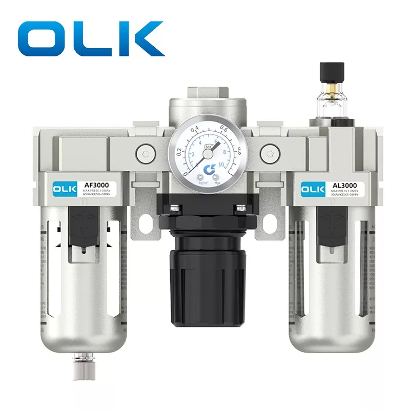Модулът SMC тип AC FRL (филтър-регулатор-лубрикатор) е пневматичен основен компонент, който интегрира филтриране на източника на въздух, намаляване и регулиране на налягането и обработка на смазване. Осигурява чист, стабилен и смазан сгъстен въздух за пневматични системи, като по този начин удължава живота на пневматичните компоненти и подобрява стабилността на системата. OLK AC Series FRL Unit действа като основен "пазител" на съвременните пневматични системи.
