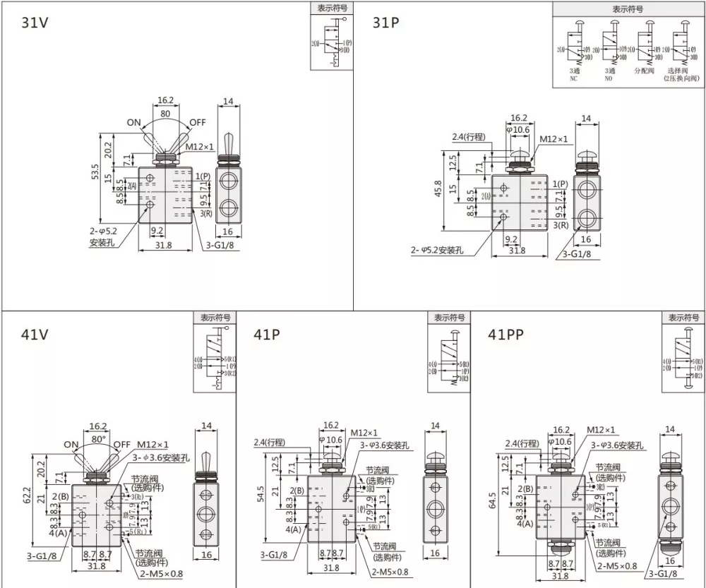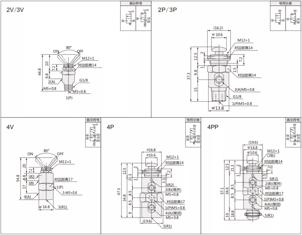 TAC серията превключваща клапа има 2 позиция 2 начин, 2 позиция 3 начин и 2 позиция 5 начин могат да бъдат избрани. Различни типове лост и резба от два типа: M5, G1/8.